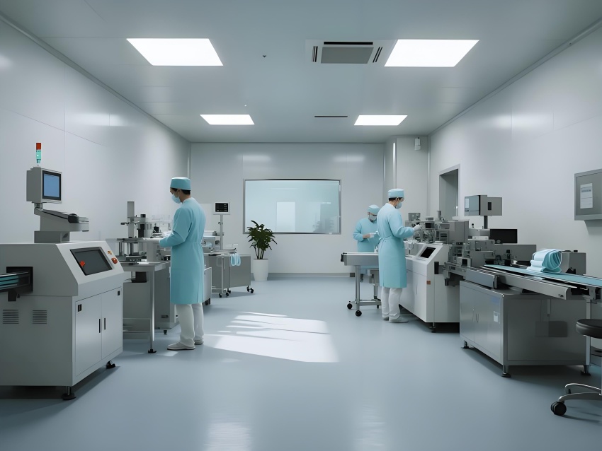 本潔凈車間設(shè)計采用現(xiàn)代工業(yè)極簡風格,強調(diào)功能性與潔凈度。主色調(diào)選用淺灰藍(墻面)與純白(頂面)的搭配,營造冷靜專業(yè)的氛圍,局部用淡綠色做視覺緩沖。