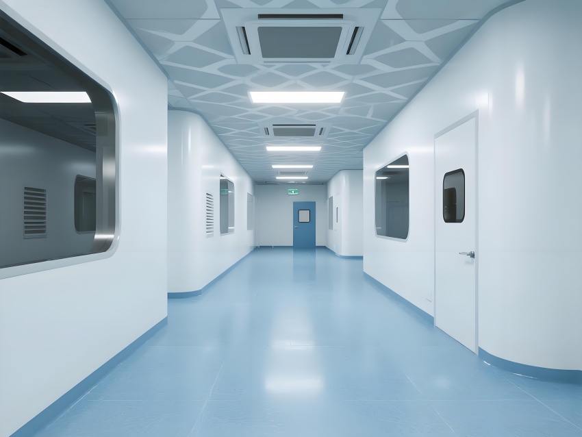 本車間空間以冰川藍(lán)與鈦白為主色調(diào),弧形墻角與無(wú)縫地坪構(gòu)成流暢的潔凈界面,頂部蜂窩狀FFU陣列形成科技感天花肌理。灌裝區(qū)透明亞克力防護(hù)罩展示自動(dòng)化生產(chǎn)線運(yùn)作,配合層流工作臺(tái)的紅色氣流可視化設(shè)計(jì),強(qiáng)化無(wú)菌核心概念。功能模塊通過(guò)地面灰色導(dǎo)視帶串聯(lián),設(shè)備區(qū)的鏡面不銹鋼與控制面板的藍(lán)色背光形成冷調(diào)光效。玻璃觀察窗嵌入電子壓差計(jì),走廊的漸變光環(huán)境引導(dǎo)系統(tǒng)在滿足GMP動(dòng)態(tài)監(jiān)測(cè)要求的同時(shí),營(yíng)造出未來(lái)實(shí)驗(yàn)室般的專業(yè)氛圍,緩解員工長(zhǎng)時(shí)間密閉作業(yè)的疲勞感。