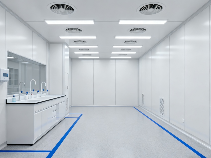 實驗室潔凈度嚴格遵循萬級標準(ISO8級),每立方米空氣中≥0.5μm微粒數(shù)≤352000個,采用初效-中效-高效三級空氣過濾系統(tǒng),配合垂直層流送風設(shè)計,實現(xiàn)每小時20-25次空氣置換。室內(nèi)墻面采用耐腐蝕潔凈彩鋼板,地面為PVC無菌卷材,所有接縫做密封處理;溫度控制在22±2℃、相對濕度50±5%RH,部分區(qū)域維持5-8Pa負壓,有效防止交叉污染,符合生物安全實驗室建設(shè)規(guī)范。