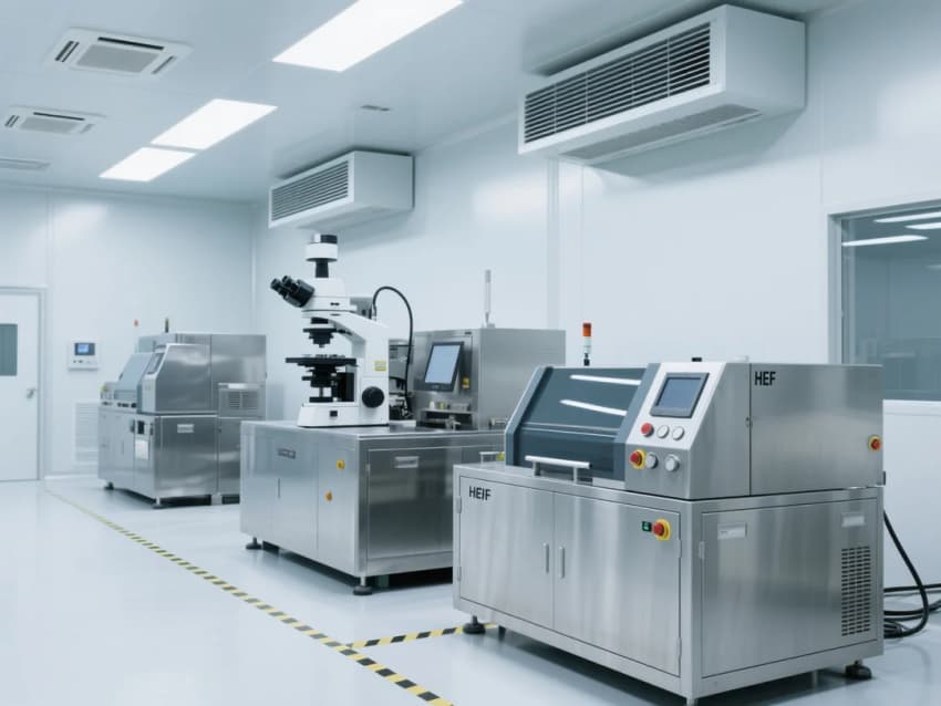 天花采用模塊化FFU(風機過濾單元)系統,配合高效HEPA過濾器,維持穩定的氣流組織與潔凈度。設備區采用淺灰色不銹鋼圍擋,與白色潔凈墻面形成視覺區分,同時便于日常清潔維護。嵌入式LED無影燈帶提供均勻照明,減少作業陰影。整體設計強調功能性、安全性與可持續性,滿足電子光學制造的高標準環境需求。
