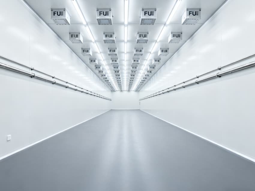 內部6個生產車間均為無設備空曠布局,按百級潔凈標準建設:地面鋪設防靜電環(huán)氧自流平,墻面采用無顆粒潔凈彩鋼板,陰陽角做R30圓弧處理杜絕積塵;柱網間距設為9米,預留光刻機、晶圓檢測設備等重型設備安裝點位;頂部整合恒溫恒濕系統(tǒng)、高效空氣過濾器及防頻閃LED照明,所有管線暗藏于吊頂內,最大化釋放空間高度,為芯片晶圓制造、封裝測試等核心環(huán)節(jié)提供超潔凈、高穩(wěn)定的專屬生產環(huán)境。