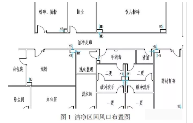 有的潔凈室空調(diào)設(shè)計(jì),一個(gè)潔凈區(qū),面積很大,布置了4 個(gè)高效送風(fēng)口,但回風(fēng)只有一個(gè),布置在一個(gè)墻角。這樣做,使得全室空氣流向一處,必然存在死角,潔凈空氣難以到達(dá),使該區(qū)域塵埃粒子增多,影響潔凈度。而回風(fēng)速度大,會(huì)在回風(fēng)口附近甚至工作面高度形成較強(qiáng)渦流,使得塵粒擴(kuò)散,同樣影響潔凈室空氣質(zhì)量,影響潔凈度。所以,非單向流潔凈室回風(fēng)口要根據(jù)風(fēng)量布置,風(fēng)速不能過大,以不大于2m/s 為宜。回風(fēng)口要布置于兩面(或多面)墻上,為了不增加衛(wèi)生死角,一般對(duì)角布置。潔凈室寬度不大于3m 時(shí),可以單側(cè)布置。