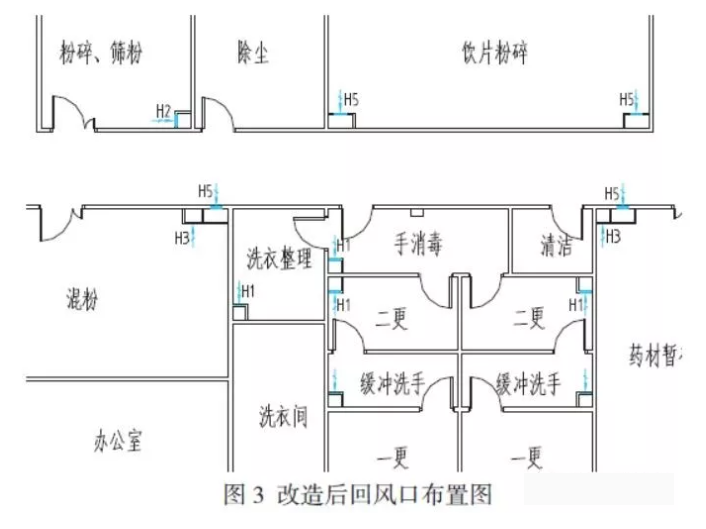 根據(jù)生產(chǎn)工藝及正壓要求,不同正壓值要求房間分設(shè)回風(fēng)柱,各在回風(fēng)口或回風(fēng)管接閥門進(jìn)行調(diào)節(jié),回風(fēng)口設(shè)過濾網(wǎng)。另外,飲片粉碎、混粉等污染潔凈間,在靠近污染工藝設(shè)備處設(shè)排風(fēng)口,及時(shí)把產(chǎn)生的污染空氣排出潔凈室外。改造后經(jīng)調(diào)試,潔凈區(qū)與普通區(qū)壓差+10Pa,潔凈走廊與混粉等污染房間壓差+5Pa,測(cè)試正壓值和潔凈度一次通過,運(yùn)行近兩年也沒出現(xiàn)問題。